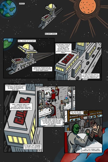 Another Space follows the crew of a small drop ship in the Galactic Union Of Space Ships (or G.U.S.S. for short). When an S.O.S. call is received from a planet previously to be undeveloped enough to transmit messages to space, it is up to our plucky crew to investigate.